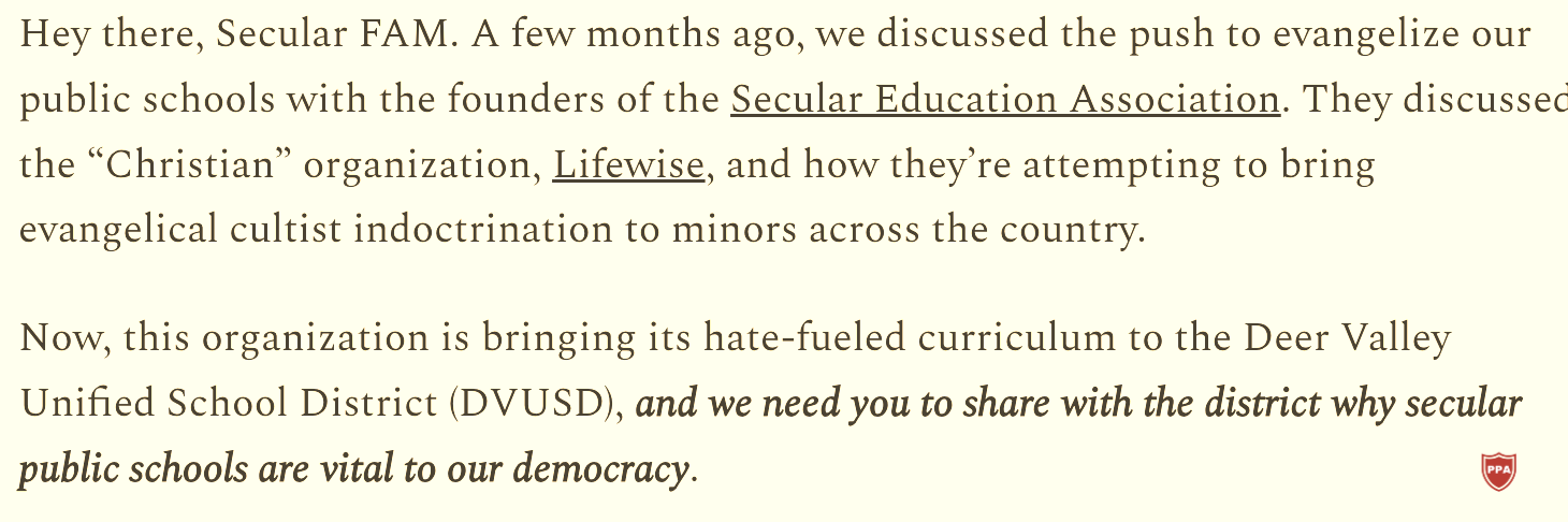 Below are quotes written by a sleazy secularist in an article titled “A Hate-filled Christian Curriculum, Coming to a District Near You.” This unhinged rant was inspired by the expansion of LifeWise Academy into Deer Valley Unified School District. The Academy’s mission is to “offer Bible education to public school students during school hours” (off campus, mind you).
